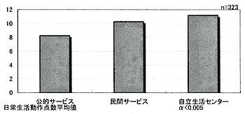 日常生活動作で介助が必要な程度と、サービス提供先は有意な関連があり、公的サービスの利用者が最も障害が軽く、自立生活センターの利用者が最も障害が重い。