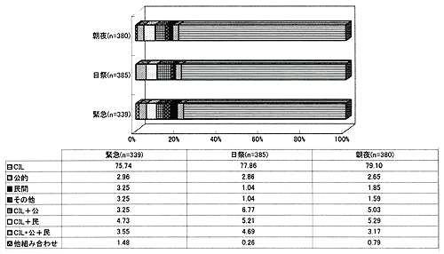 日曜祭日は、自立生活センターと公的サービスを併用している人の割合が増える。また緊急時には、ボランティアや個人介助者と思われる「その他」の割合が増えている。