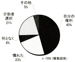 抵抗感のない理由としては、「自分の権利だから」「抵抗感のない介助者を選んでいる」の割合が高い。一方で、「慣れたので感じない」という消極的な理由もあげられている。