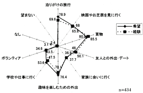 性別や年齢、居住地、自立年数など他の属性項目との有意な関連はないが、日常生活動作とは、有意な関連があり、日常生活動作に介助が必要な人ほど、外出経験、希望がともに高い。