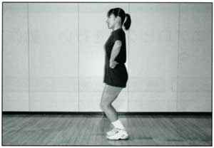 (1)その場で歩行運動を行う (2)「足の動作」をつける E 8歩中 両膝曲げ 4回 F 8歩中 かかとタッチ 4回 G 8歩中 膝を高くあげて歩く 8回 H 8歩中 大きく横に足を開いて歩く 8回 |