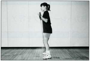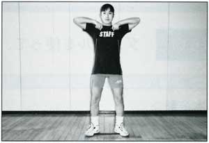 (1)足を肩幅よりやや広めに開き、つま先をやや外側に向け、膝を曲げて背筋を伸ばして立つ