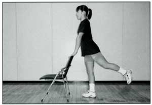 (1)いすの背もたれ側に立ちいすに両手をかける (2)片足ずつ後方に上げる(10回ずつ) |