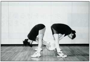 (1)両手で頭上から渡す 10回 (2)両手で足の間から渡す (3)両手で体を捻りながら渡す 左右 |