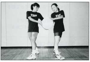 (1)両手で下から投げあげる 10回 (2)両手で頭上から投げる 10回 (3)両手で頭上から、1回バウンドさせて投げる 10回 |