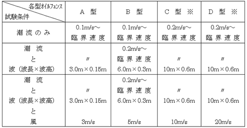 このことから、第10基準研究部会(RR10)、委員長 元良誠三(当時東京大学)、委員会では型式承認品であるA型及びB型オイルフェンスの滞油性能を調査研究することとなり、C型及びD型の試験条件を参考に内湾用のA型及びB型の試験条件を表II-8.4に示す気象・海象とした。