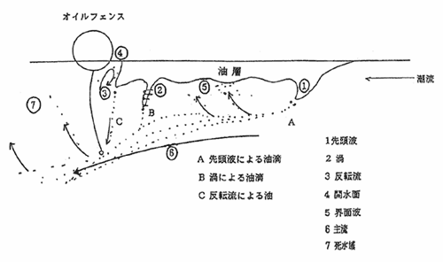 浮上した油は死水域の逆流によって一次フェンスの後面に輸送され、大部分が滞油する。