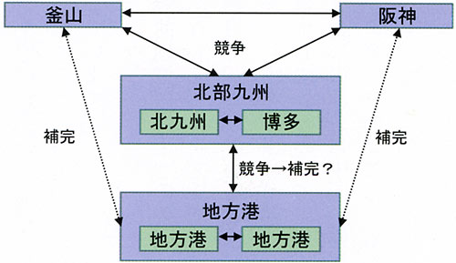 九州における国際港湾の競争関係を模式図(図8)にしてみました。北部九州対地方港、北九州対博多、地方港対地方港というのがあって、地方港発着の貨物というのは、阪神か釜山を経由していくというと、変な話ですけれど、敵の敵は味方みたいな関係があるということになってきます。その結果として、図8の上の三角形の競争というのが生じうるということになって、非常に輻輳的、多重的な競争関係があります。これからトランシップの貨物をとるという場合には、もっぱら海外の港と競争していくわけですけれども、同時にこういう、いろんな場面での競争がありうるということですね。