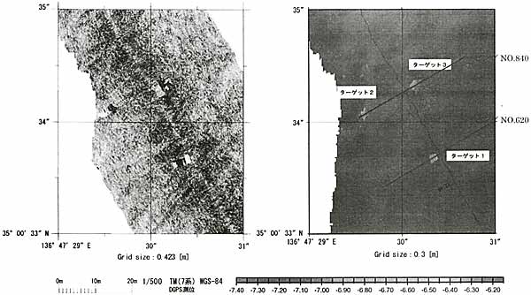 図31は、LINE-3の地形歪み除去画像と除去前の音響画像である。地形図と比較した図を図32に示した。LINE-2と同様、ターゲット1については、ターゲット上の箱の形状を明瞭に復元している。しかしながら、ターゲット3については、同じくLINE-2と同様、ターゲット上に設置した箱の形状を認識することはできない。ターゲット2はLINE-2に比べて、測線の方向がターゲットの上面の箱と平行しており、上面の箱の設置方向を画像から読み取ることができるが、その移動変位を読み取ることはできない。