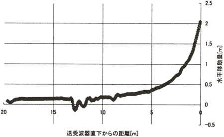 図34は、ターゲット2と3を捉えたピングNO.840の地形断面図及び音響画像データの水平移動量である。左舷側のターゲット2は、送受波器直下近傍の音響画像データの水平移動量が大きく、外側になるにつれて減少する。逆に右舷側のターゲット3は、仮想海底面との差が左舷のターゲット2と同じものの送受波器から離れているため、水平移動量が小さい。