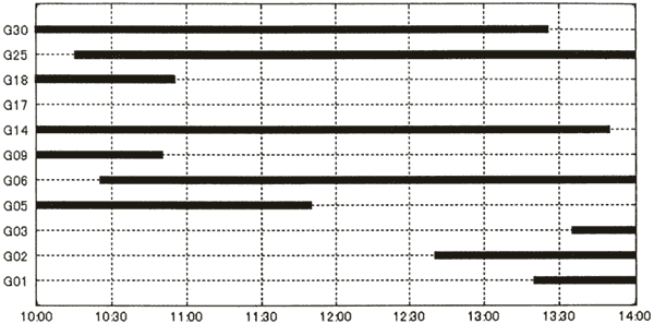 図69. 平成14年度名古屋実験における衛星ごと捕捉状況の時系列変化