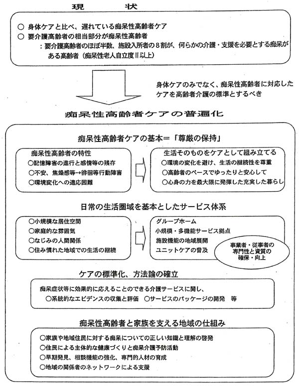 ・要介護高齢者のほぼ半数は痴呆の影響が認められる者であるにもかかわらず、痴呆性高齢者ケアは未だ発展途上、ケアの標準化、方法論の確立にはさらに時間が必要。