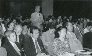 一三六名の受講生を乗せた送迎バスが、定刻よりやや遅れて湘南国際村センターに滑りこんできました。一行は足早に国際会議場へ向かうと、矢萩保三事務局長より必要事項が通達され、国歌斉唱、鈴木吟亮専務理事による「開講のことば」とつづき、緊張した雰囲気の中で平成十五年度夏季吟道大学がはじまりました。学長挨拶では河田和良会長が笹川良一創始会長と笹川鎮江会長のご意思を受け継ぎ、吟剣詩舞の発展に邁進する所信を表明されました。受講生誓いのことばを武川甲洲さんが堂々と述べられ、受講生記念合吟の先導を長山嶺風さんが立派に勤められました。