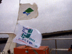 船は室蘭港を出ると徐々に速度を上げ、おおよそ28ノットで海上を快適に飛ばす。最高速は30ノットというから、ほぼ最高速度に近いスピードである。時速にすると約60km/hというところか。もちろん、マストには、高らかと、「日本ぐるっと一周・海交流」フラッグが掲げられている。