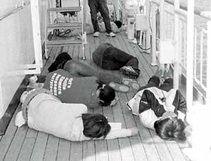 岸壁への接岸が無理と判断し国土交通省の交通艇わかなにて乗下船した。2mのうねりがあるとみて出港せずプログラムを行なった。