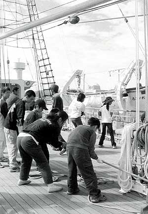 動揺大きく港内に錨泊しマスト登りを行なった。