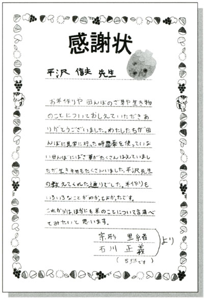 お父さん、お母さんの頃はこの様な「総合的な学習」は無く、農家で無ければ食生活も米離れで育ったので、玄米を食べるなんて、吃驚されたことでしょう。米作りは市民の親子の参加を歓迎しています。これからも是非「米づくり」に参加して下さい。米作りを共に体験することにより親子の会話も増え収穫の感動・喜びを分かち合えることは子供の情緒教育にも役立つと考えます。瑞穂の国に生まれた私達の食の原点を考えるとても大切なことと思われます。