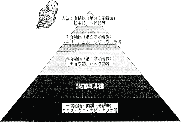 その関係(かんけい)を図(ず)にしたものを『生態系ピラミッド』と呼び(よび)、上(うえ)の図(ず)です。