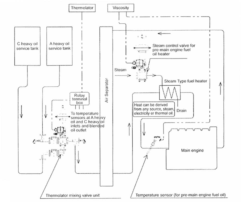 Each of the H.F.O. inlet and the M.D.O. inlet has a temperature sensor, which measures the temperature on a real time basis. The temperature at which the blended oil can achieve the set blend ratio is computed from the readings of these sensors, and the two kinds of oil are blended to that temperature and fed from the automatic mixing valve unit of the thermolator. The supplied oil will be the desired blend, which is fed to the engine as it is.