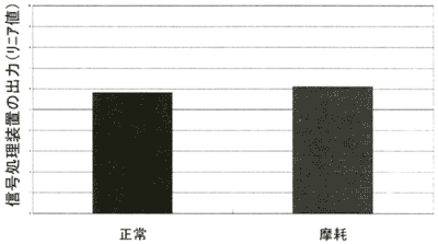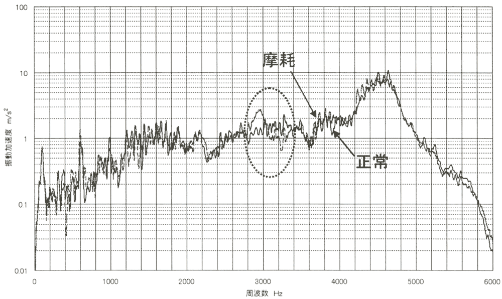 次に爆発上死点でのスラップのタイミングで時間ゲートをかけて周波数分析をし、RMS値を求めたが、周波数軸上で広帯域の変化は見られず、狭帯域でしか評価ができない上に、正常時と摩耗時とのRMS値の差が小さい。( 図2.5.2.3-13、 -14参照)。