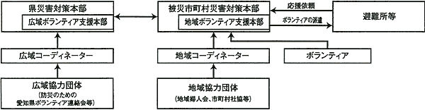 2 県は、支援本部の開設に当っては、ボランティアと被災地の住民等からの支援要請との調整役となるボランティアコーディネーター(以下「コーディネーター」という。)の派遣を協力団体に要請する。