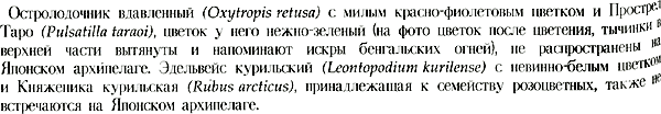 赤紫色の可憐な花を咲かせるコダマソウ(Oxytropis retusa)と薄緑色の花を咲かせるカタオカソウ(Pulsatilla taraoi)(写真は、花のあとに雌しべの上部が伸びて線香花火のようになった姿)は日本列島にない植物です。白い可憐な花をつけるエーデルワイスの仲間である、チシマウスユキソウ(Leontopodium kurilense)やバラ科のチシマイチゴ(Rubus arcticus)も日本列島では見られません。