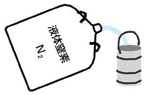 (1)手袋をはめ、液体窒素貯蔵容器から魔法瓶(デュワー瓶)に液体窒素を9分目まで入れる。