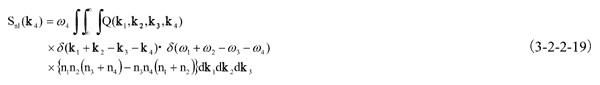 ここに、n( k)=E( k)/ωは波の作用密度(Wave Action)で、積分核関数  はスペクトル成分の結合係数、δはデルタ関数を表す。デルタ関数は共鳴条件を表しており、以下の関係を満足する4つの成分波間で共鳴が生じる。