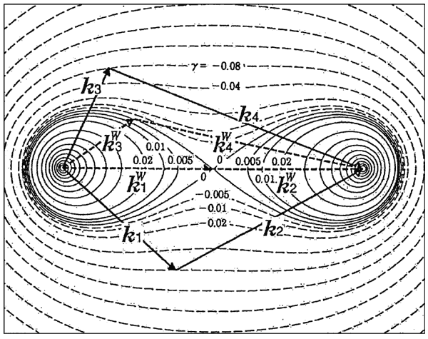 ここに、成分波の進行方向をθとすると、k=(kcosθ,ksinθ)、k=|k|である。この図から、2つの成分波(3&4)が決まれば残りの2つの成分波(1&2)が1つの自由度γnl=const. の曲線上に決まることが分かる。ここに、γnlは次式で定義されるパラメータである。(Masuda, 1981)
