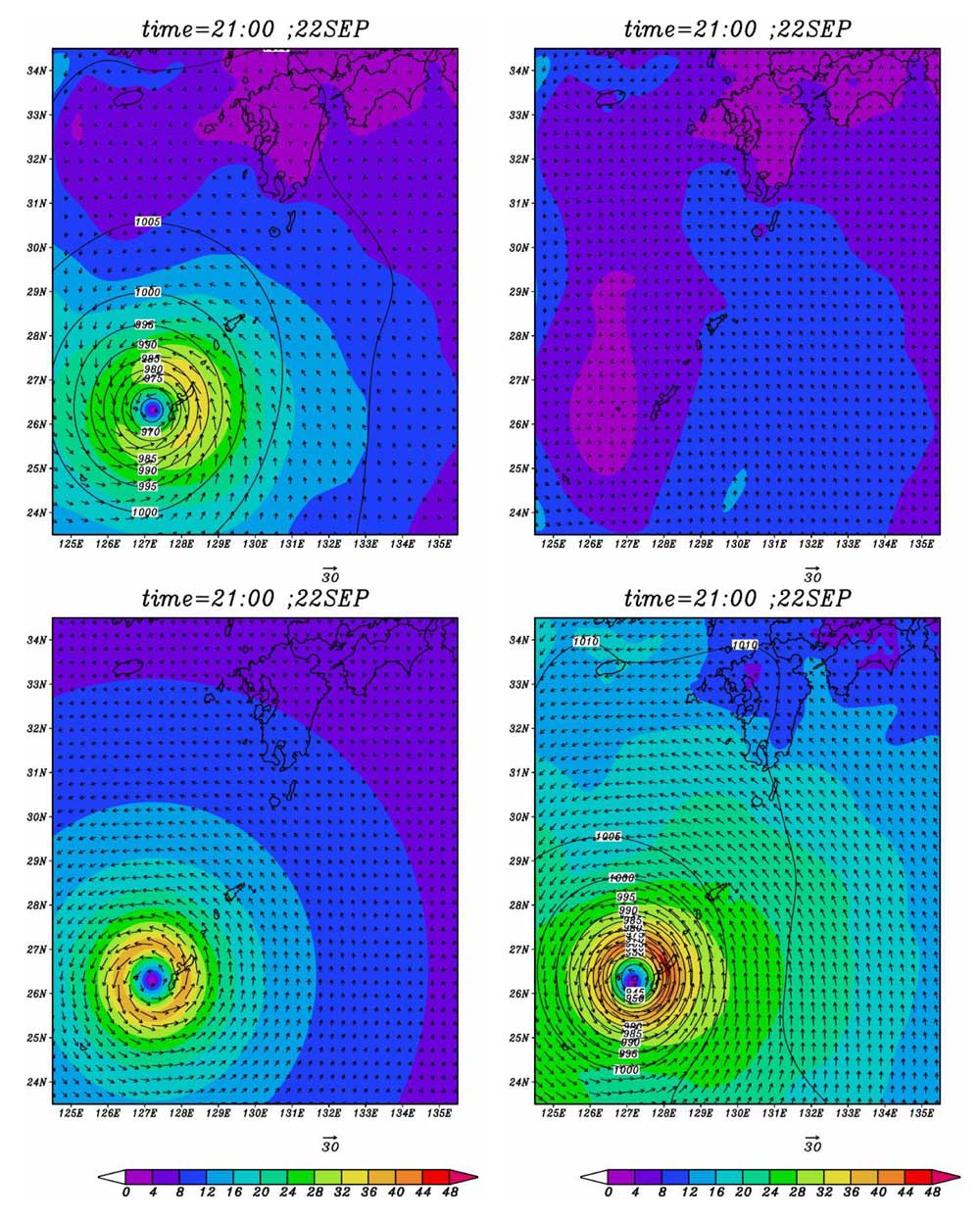 (左上:ボーガス投入前解析値、右上:台風除去後、左下:投入したボーガス台風、右下:ボーガス投入後解析値)