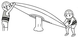 (2)ウラ返した艇の、バウ、スターンを交互に上下(シーソーの要領)させて残った水を抜く。