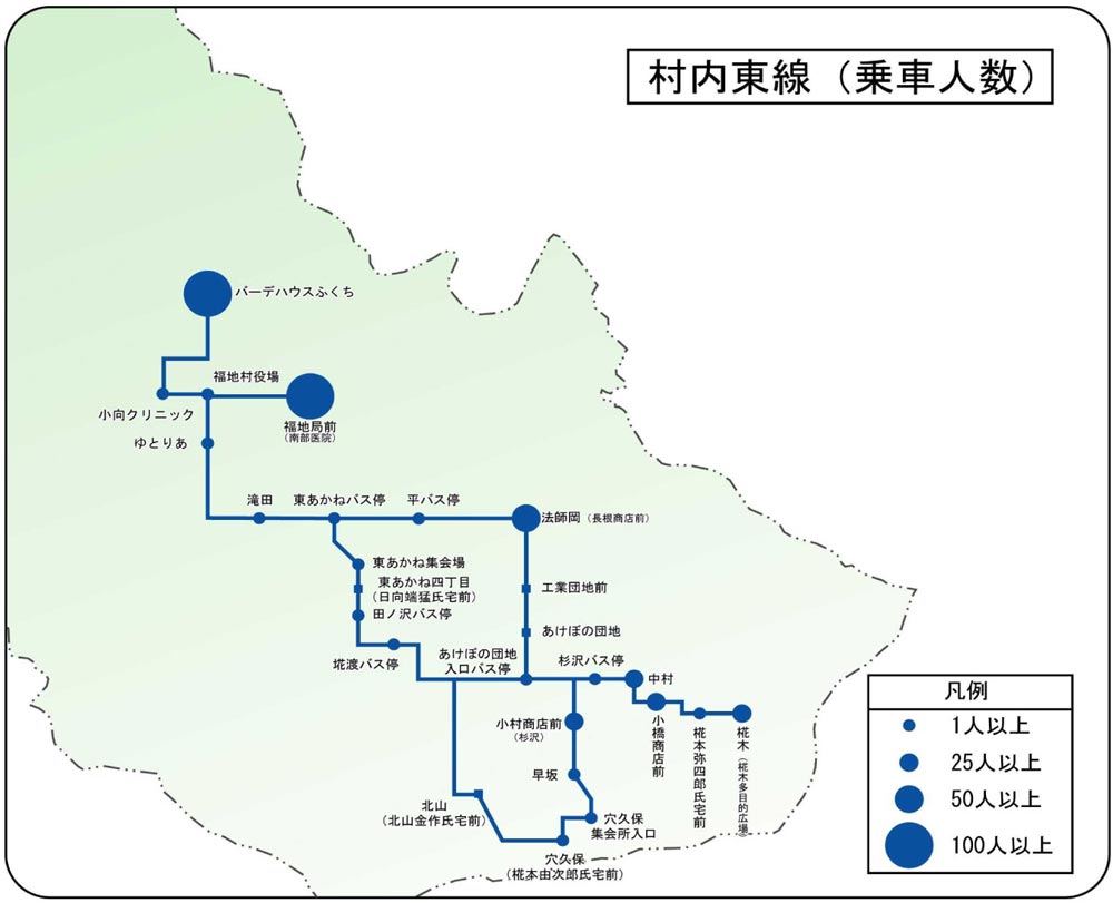 乗車場所として多かったのが、バーデハウス(169人(26%))や、福地局前(112人(17%))だった(基幹路線等からの乗り継ぎを含む)。上記以外では、村内南東部を中心とした既存バス路線がない地区からの乗車が多く(早坂18人、小村商店前26人、中村〜椛木134人)、これらの地域の生活交通を担っていたことが伺える。目的地も、出発地の場合と同様の傾向が見られる。
