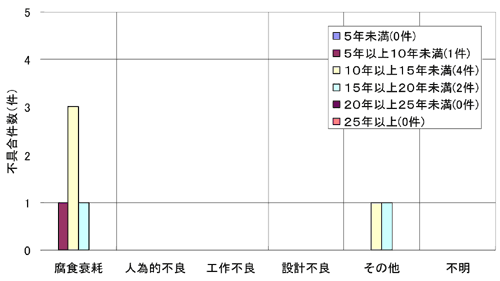 各検査において、船底弁等に不具合が生じた船齢について、不具合原因別にその不具合件数を調査した結果を図6.2.3および図6.2.4に示す。なお、ここでは船齢が不明な不具合についてはカウントしていない。図より明らかなように、腐食衰耗を不具合原因とする結果に着目した場合、船齢が5以上10年未満で不具合が発見され始め、10年以上15年未満で最も不具合が発見されている。また、船種ならびに検査別による不具合が生じた船齢の相違におよぼす影響はほとんど認められない。なお、参考までに、各検査において、船底弁等に不具合が生じた船齢についてその不具合頻度分布を調査した結果を図6.2.5に示す。図より分かるように、上記結論を支持する結果が得られた。