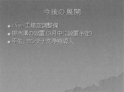 2 製氷冷凍庫と作業場がバット工場と離れていたため車輌積込、台車運搬に時間ロスと積荷落下の危険性があった