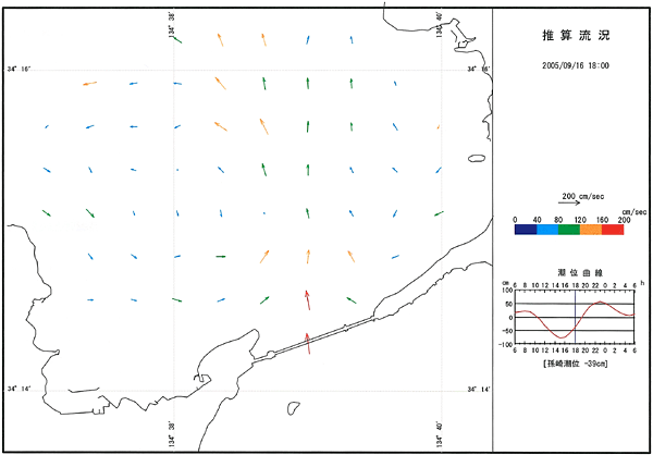 潮流予測システムは、前項で計算した各格子の潮流調和定数を用い、任意時刻の潮流図をパソコンディスプレー上に表示するシステムである。