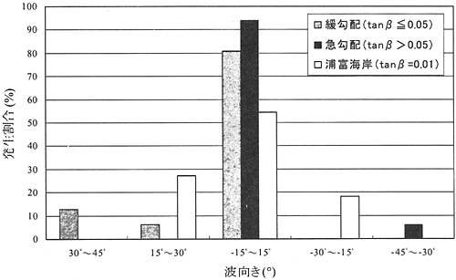 ここまで潮位による流れの変化を見てきたが、ここからは波向きによる流況の変化について検討する。これまで行われた離岸流の実測結果をまとめると、波向きがほぼ直角入射の場合に圧倒的に観測数が多く、波向きが20度以上になると極端に観測数が減少している(図−2.3.49)。