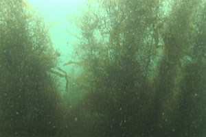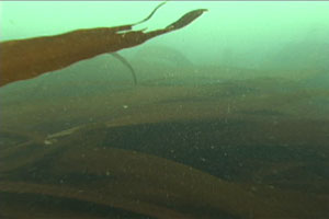 崖下に連なる砂利浜にゼニガタアザラシの上陸を確認。約200mの距離をおいて海中に入り、潜水してアザラシへの接近を試みた。親子が数組確認することができた(写真1)。海中は遠浅で、フラットな海底が広がっていた。透明度は2mほど。アイヌワカメ、スジメ、ナガコンブ、オニコンブなどのコンブ類(写真2)、ホンダワラ類(写真3)が海底一面を覆い尽くしていた。水中でも一度、アザラシの親子と遭遇したが、透明度が悪いために出合い頭で、突然目の前に現れた人間に慌てた様子であった。