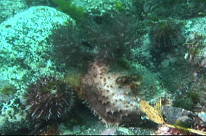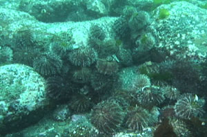 海が荒れていて、潜水する場所が無いため、波が穏やかな島の南側で潜水した。島の東岸と同様に岸から沖に向かって遠浅の海底が続いている。東岸よりも海藻は少ないような印象を受けた。むき出しになった岩の表面(写真5)には、エゾバフンウニ(写真6)、キンコ(写真7)が多数確認できた。