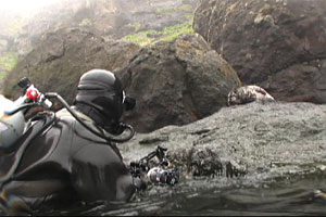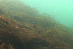 親子を含む数頭のゼニガタアザラシが上陸する岩場を確認。数100m離れた距離から海中に入り、潜水しながら接近を試みた。これまでの海中とは異なり、海底は大きな岩礁が点在して起伏に富んでいた。最大水深約8m。その表面をコンブ類を中心とする海藻類が繁茂していた(写真11)。