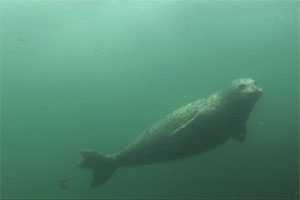 同日の午後、同所で潜水。上陸しているゼニガタアザラシを確認し、沖合から海中に入り接近を試みた。上陸場に近づいたところでアザラシが海に逃げ込み、興味を示した数個体が一瞬、こちらを観察してから(写真12)沖へと逃げていった。こうした行動を示すのは、若い個体に多い。