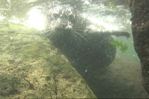 前日と同じ場所で潜水。ゼニガタアザラシの親子とパップ(当歳獣)が岩場に上陸。観察者の接近に驚いて海に逃げ込んでしまった。波打ち際の岩場も起伏に富んでいて、岩と岩のすき間を抜けながらアザラシは沖へと逃げていった(写真14)。