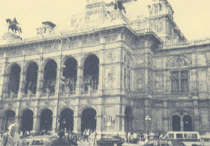 この前(まえ)の広場(ひろば)からのびるケルントナー通り(どおり)を歩く(あるく)とウィーン国立歌劇場(こくりつかげきじょう)に出る(でる)。