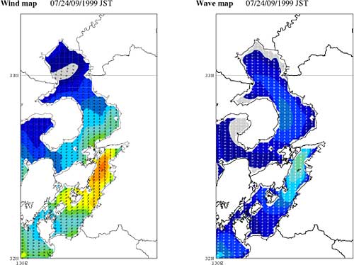 図3-1-8(2) MM5-2による風と波の分布(八代海:台風9918号)