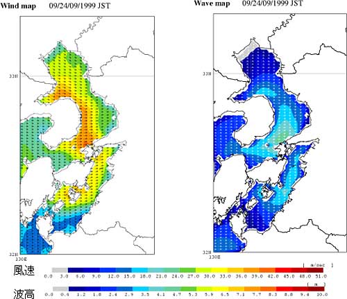 図3-1-7 MM5-2による風と波の経時変化(八代海:台風9918号)