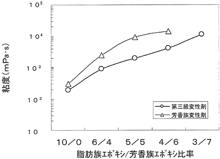 芳香族変性剤と同様に脂肪族エポキシ、及び変性剤量が多くなるほど粘度は低くなる傾向にあった。芳香族エポキシ比率が50%以下で目標の樹脂粘度になることがわかった。
