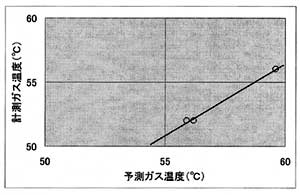 図3.2.6 増湿冷却後のガス温度の予測値と実測値の比較