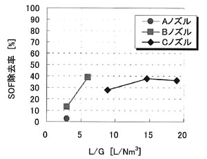図4.2.18 各ノズルにおけるSOF除去率とL/Gの関係