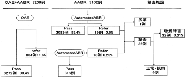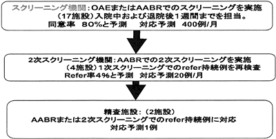 3、1次施設、2次施設をとわず、OAEでrefer検出時には2次施設でAutomated ABRで2次検査を行い、Automated ABRでもreferが持続する場合のみ、聴覚専門施設での精査を行なうプロトコールを策定した。
