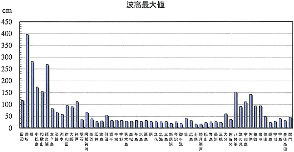 図5-7は、測定期間中における津波波高の量大値の分布を示したものである。このような図から津波の災害度合を評価することができる。なお