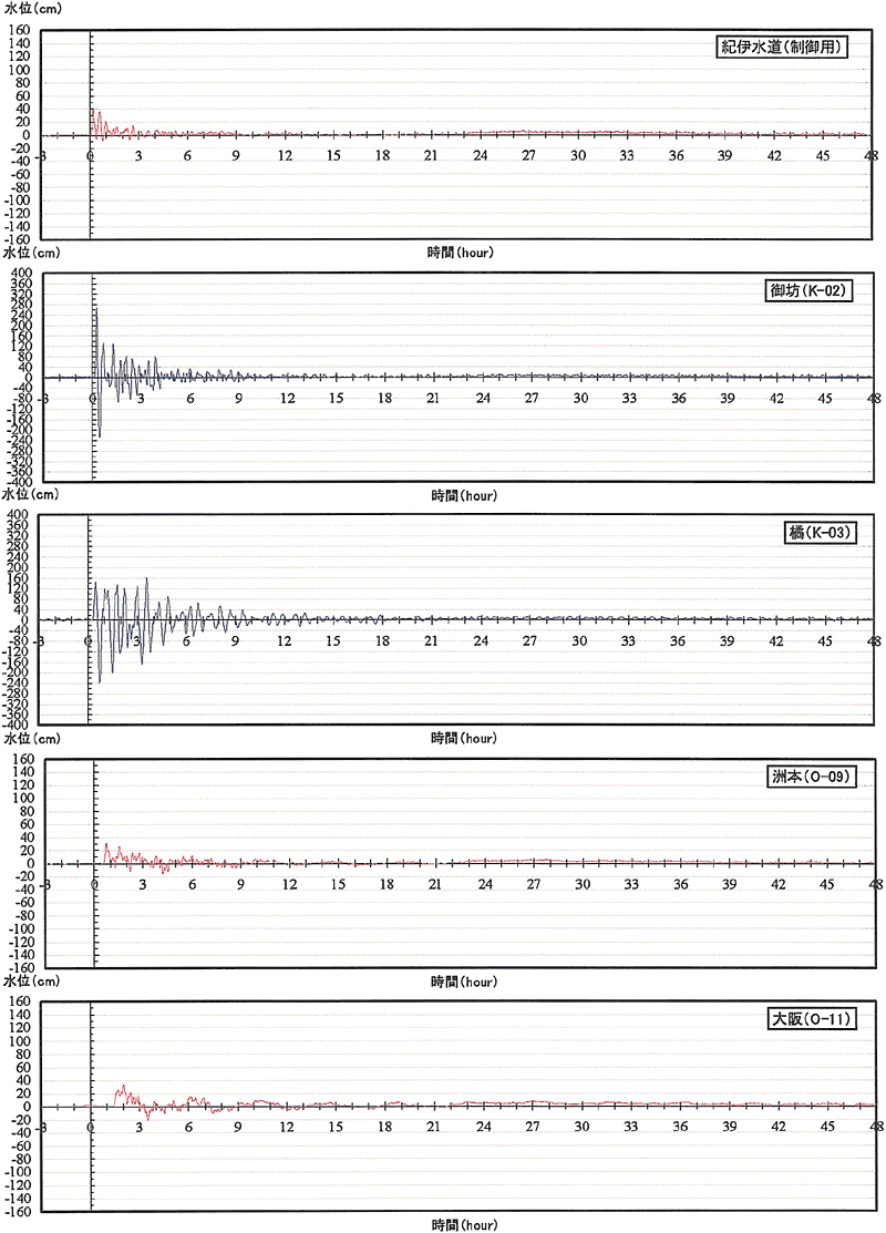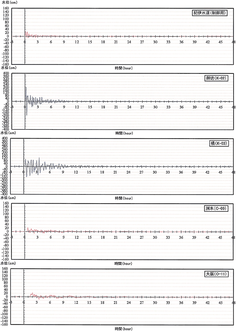 どの測点もチャンバー内の水位高さが高くなるほど津波も大きくなっているが、津波の到達時間や波形パターンに変化はみられない。またゲート操作によって発生させた津波( 図5-2参照)と、津波発生装置によって発生させた津波を比較すると、津波の到達時間や波形パターンは非常に良く似ている。津波波高の大きさは、ゲート操作によるものよりも小さいが、それでも規模3の御坊で320cm強、大阪で40cm強ほどでている。